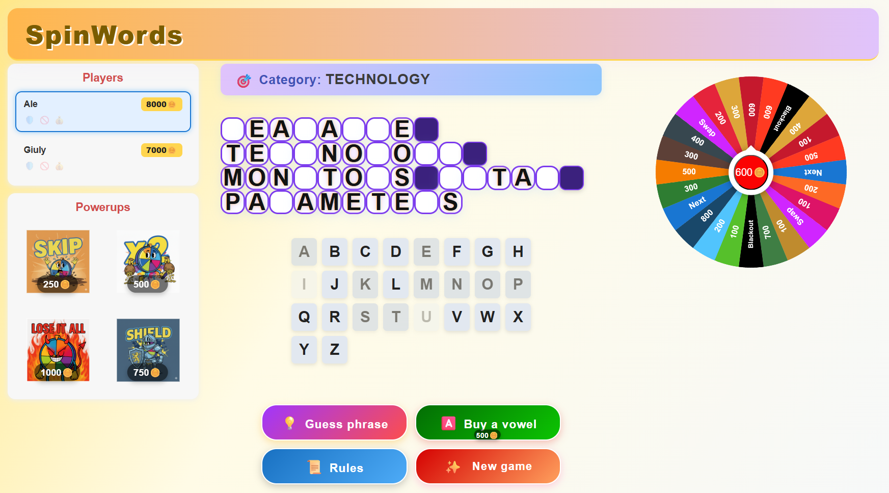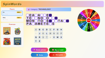 SpinWords is a puzzle game based on Logic, strategy and a bit of luck! Turn the wheel, guess a letter and find the mistery sentence before your opponents! Use powerups to win and have fun with single and multi player mode!